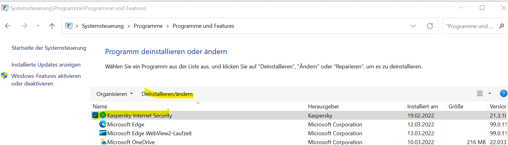 Selecteer Kaspersky Internet Security en kies Verwijderen.